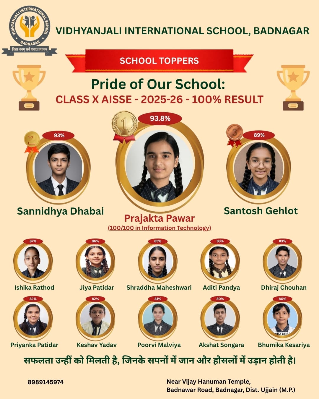 Sneha brought laurels to the School Miss Sneha Soyal of Class IX of Vidhyanjali International School, Badnagar has been selected for the State Level Inspire - Manak Awards organised by the Department of Science and Technology.