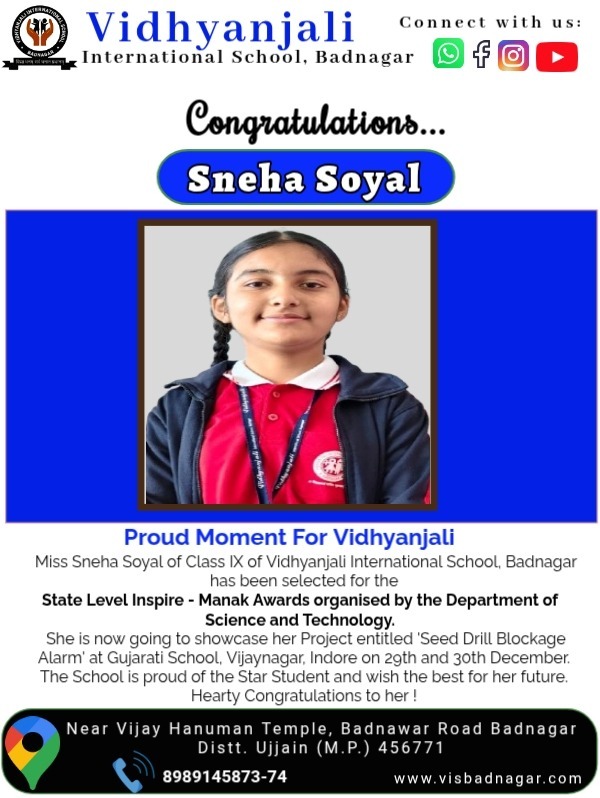 Sneha brought laurels to the School Miss Sneha Soyal of Class IX of Vidhyanjali International School, Badnagar has been selected for the State Level Inspire - Manak Awards organised by the Department of Science and Technology.
